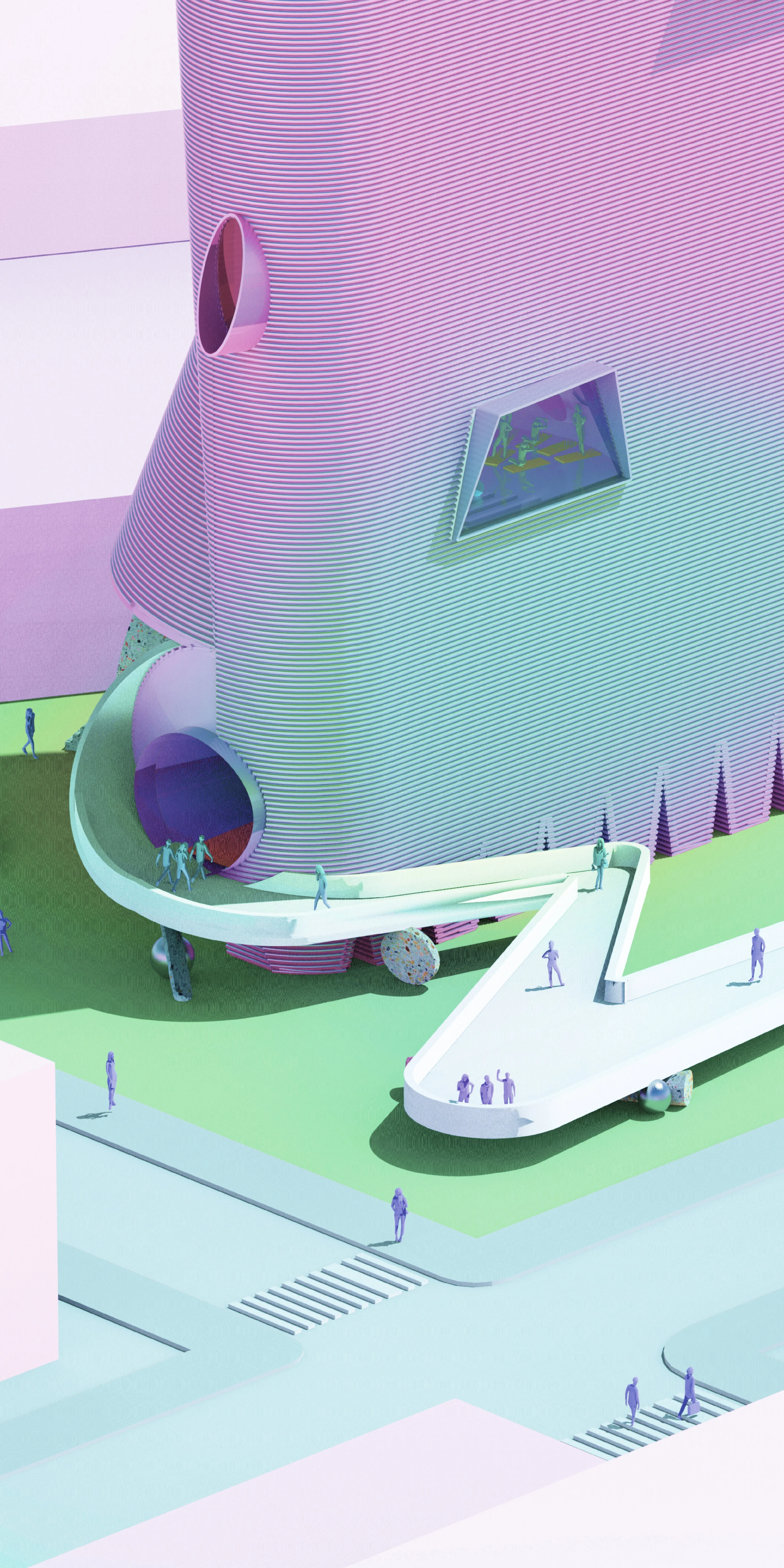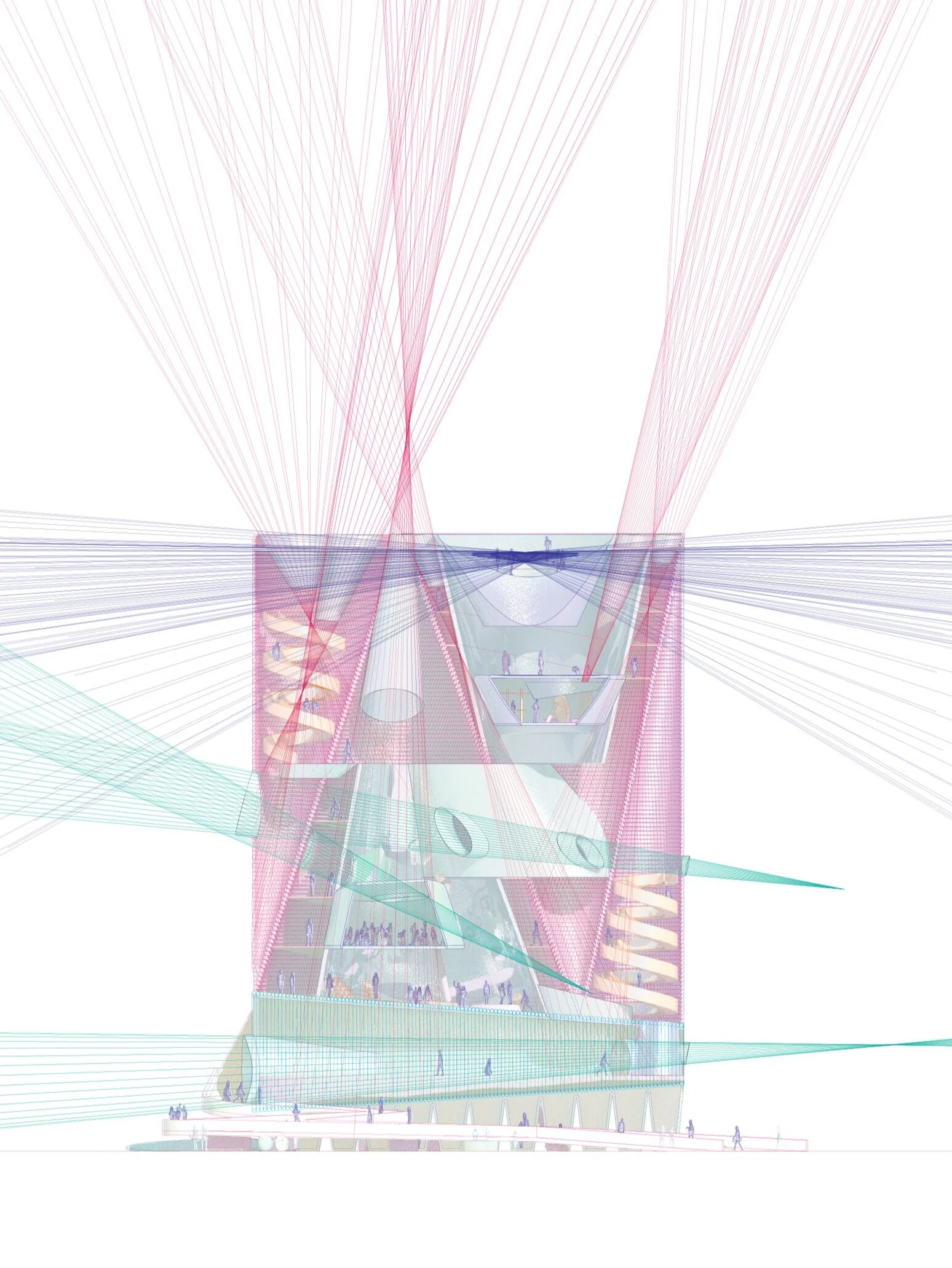 Historically, architects have placed gardens within, adjacent to, or on top of buildings, to fulfill the desire to contain “nature.” Alternatively, architecture has also become the object contained within the garden. The meaning of the garden and its relationship to architecture has changed throughout its history, From the modernist promise of the roof garden reclaiming the built land to recent grassroots movements converting rooftops and vacant lots into community gardens. In this proposal the garden lies within and becomes the architecture itself. The proposal contains objects that allude to digital space, and rely on pushing against the material hegemony of New York to introduce new aesthetics to the city. The cones of vision that the subject would experience at vital points in the project are the drivers of the design, built as a vision for a new kind of communal leisure space for the public.